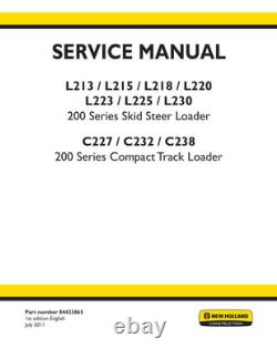 New Holland L213, L215, L218, L220, L223, L225, L230, C227, C232, C238 Skid Steer Compact Track Loader Service Manual. PDF/USB version is searchable and printable. Printed version is brand new in shrink wrap and will require a binder (not included). Operator's Manuals are bound and do not require a binder. A Service Manual (sometimes referred to as a Repair, Technical, Workshop or Shop Manual) is often large and broken down in to sections for different parts of your equipment.
