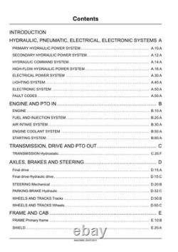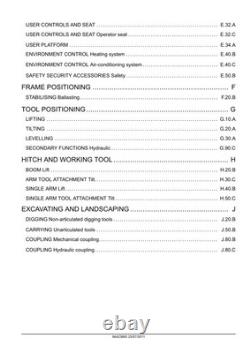 HYDRAULIC, PNEUMATIC, ELECTRICAL, ELECTRONIC SYSTEMS - A. ENGINE AND PTO IN - B. TRANSMISSION, DRIVE AND PTO OUT - C. AXLES, BRAKES AND STEERING - D. FRAME AND CAB - E. HITCH AND WORKING TOOL - H. EXCAVATING AND LANDSCAPING - J. HYDRAULIC / HYDROSTATIC DETAILED VIEWS.