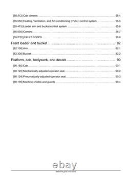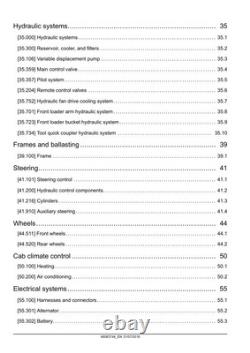 Brakes and controls - 33. Frames and ballasting - 39. Cab climate control - 50. Front loader and bucket - 82. Platform, cab, bodywork, and decals - 90.